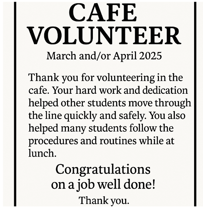 Thank you for volunteering in the cafe. Your hard work and dedication helped other students move through the line quickly and safely. You also helped many students follow the procedures and routines while at lunch. Congratulations on a job well done! Thank you.